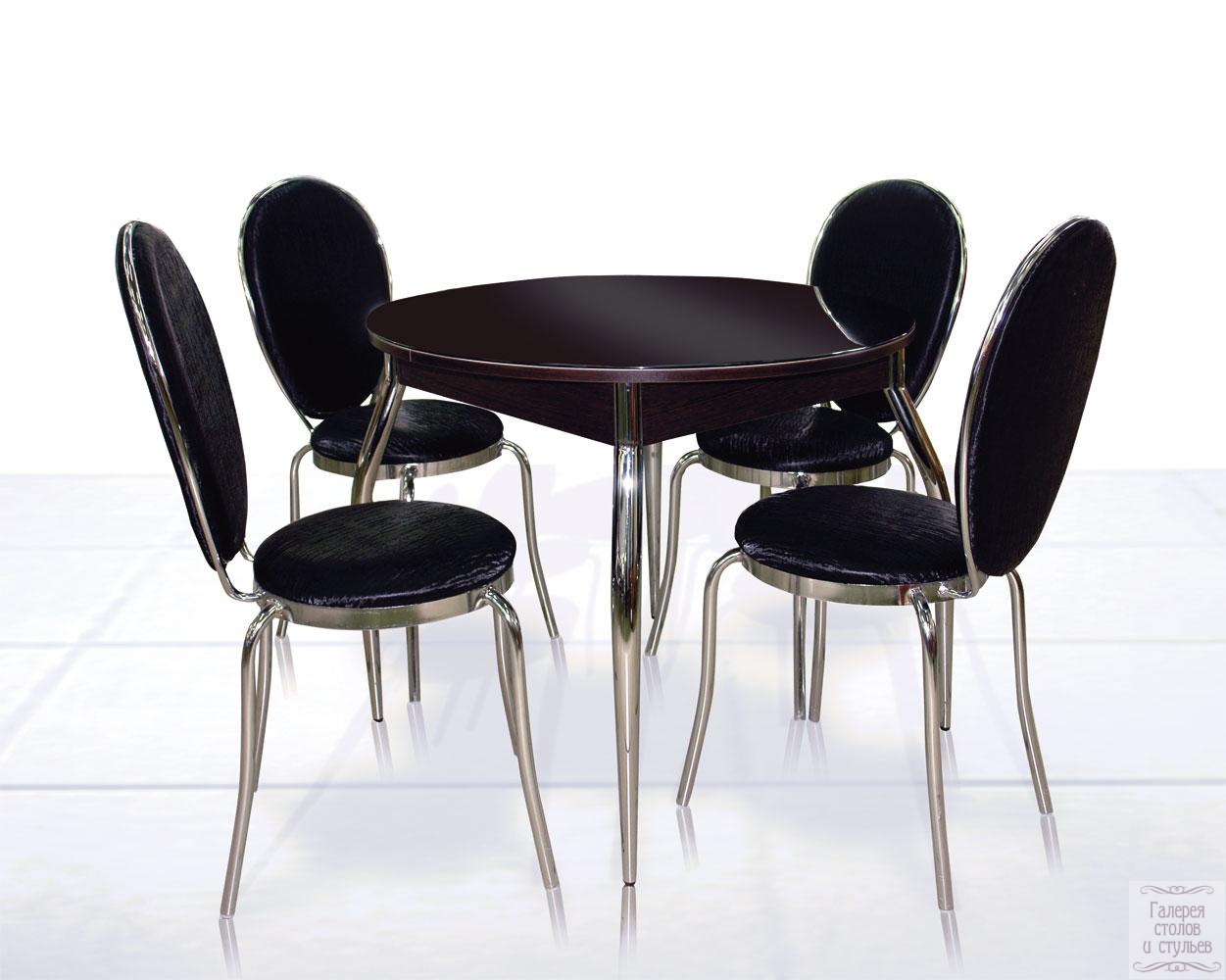 Стол «Капелла» черный глянец Материал: закаленное стекло Размер, мм: D 900(+300) Цена 11 500 руб. Стул «Остап» черный бенгал. Цена 2 700 руб.