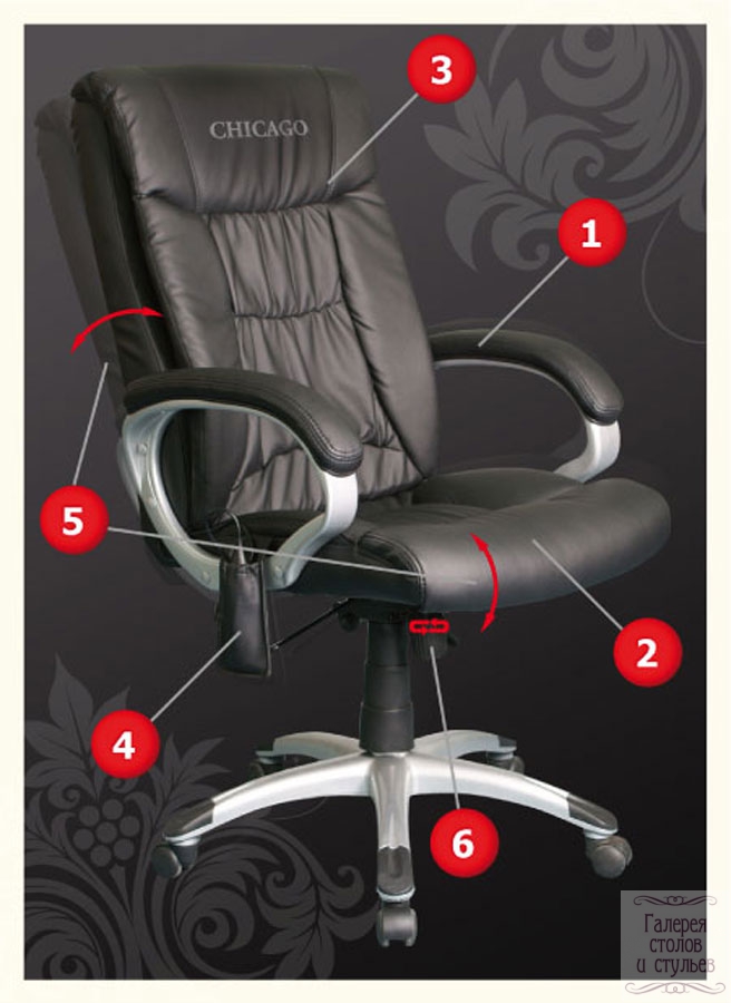 «Chicago» отличается повышенной комфортностью, что позволяет их использовать не только в качестве рабочих кресел для офисного кабинета, но также для оснащения домашних зон отдыха. Отличительные особенности модели: 1. Подлокотники обеспечивают рукам удобное положение и способствуют уменьшению усталости в области плеч и шейных позвонков. 2. Подколенник в передней части сидения устраняет избыточное давление в области подколенных суставов, что способствует улучшению кровообращения ног. 3. Подголовник оптимальным образом перераспределяет нагрузку на шейные позвонки пользователя. 4. Удобный чехол для пульта позволит за несколько секунд превратить массажное кресло в классическое офисное и погрузиться в активный рабочий процесс. 5. Специальный синхромеханизм изменяет угол наклона сиденья синхронно с изменением угла наклона спинки под действием веса пользователя в наиболее оптимальной эргономической пропорции. 6. Возможность настройки механизма качания в зависимости от веса пользователя при помощи регулирующего винта.